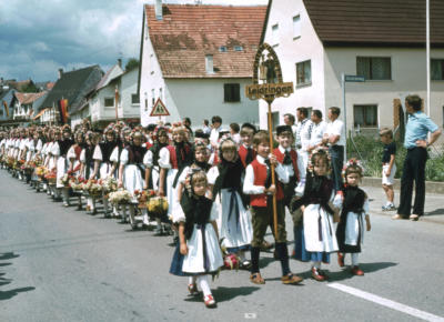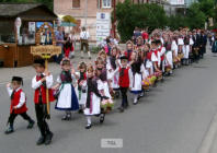 Vorneweg laufen die Kinder paarweise; die kleinen Mädchen mit bunt geschmückten