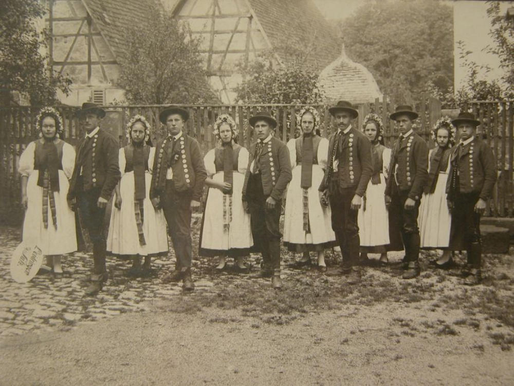 Tanten und Onkel des Brautpaares. Die verheirateten Frauen tragen eine schwarze